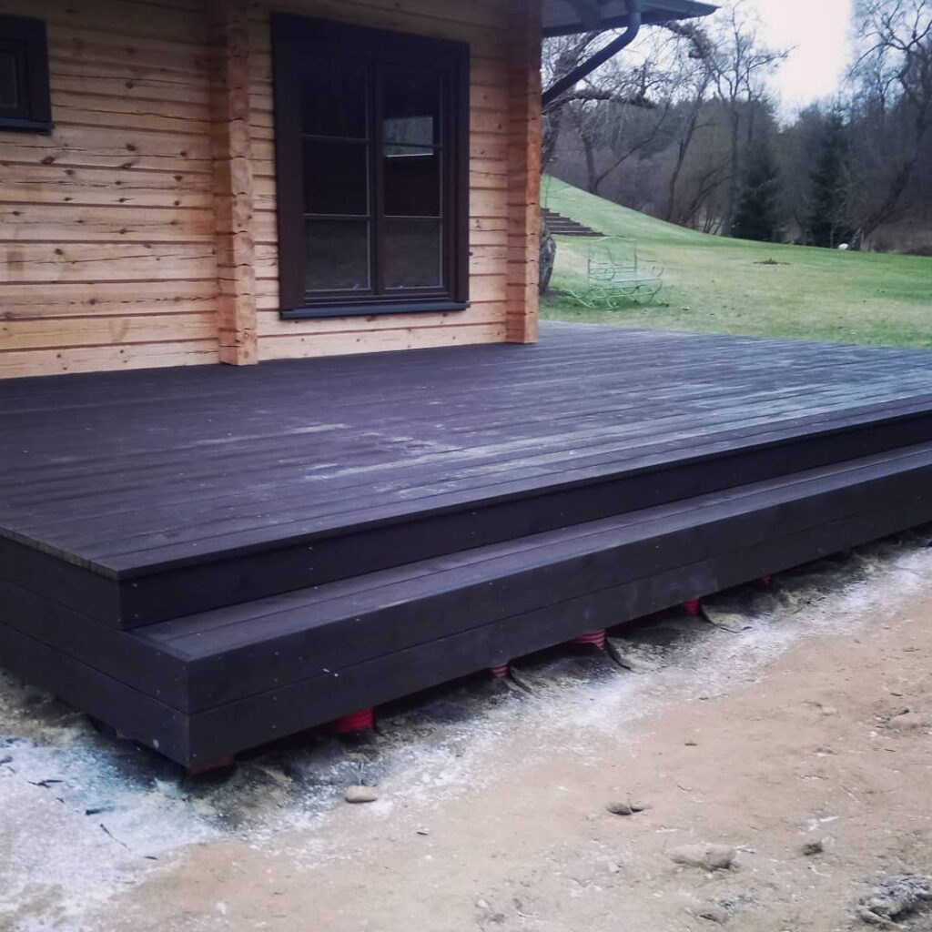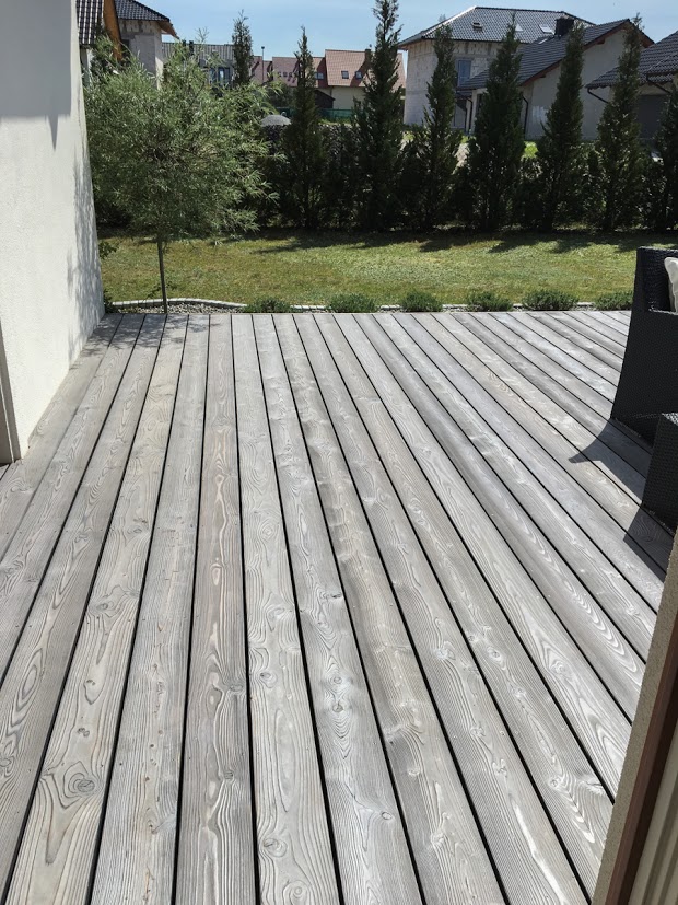 Hvis man vælger at lade sin olierede terrasse i brændt Gran stå helt uden behandling efter opsætning, så vil den patinere smukt lysegråt allerede efter 3 års tid. Der vil gå lidt længere tid mod Nord og Øst. Det anbefales, at man hvert 2. år behandler sin terrasse med en lasur olie fra Woca med farvepigment i den samme farvenuance, som terrassen leveres med, f.eks. i en brunlig farve som den brune valnød eller som den rødbrune mahogni eller som den klassiske sorte olie, for at beskytte træet mod solens stærke UV-stråler, som ellers vil patinere træet gråt ret hurtigt. Det skal dog siges, at dette vedligeholdelsesarbejde kun er af kosmetisk karakter og således ingen som helst betydning har for træets levetid.