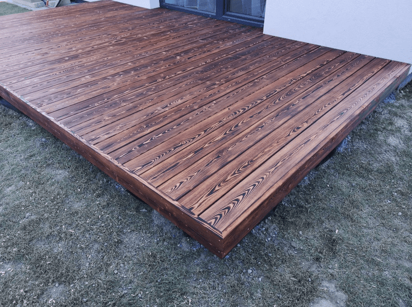 “Ki-zutzuita” (billede 3): Er med en wirebørstet overflade, som fjerner al sod og skaber en farvekontrast i træets struktur mellem det bløde vårved og årringenes mørkbrændte skorper. Man kan vælge af få “Ki-zutzuita” behandlet med en pigment-olie, så strukturen og farven holder længere tid. Eller man kan vælge en helt klar olie men så bliver terrassen næsten omgående patineret vejrgrå. Den klare olie er måske flottere, da træet ser mere ægte brændt ud. Men ulempen er, at den klare olie meget hurtigt brændes af fra solens UV-stråler, end den pigmenterede olie vil gøre.